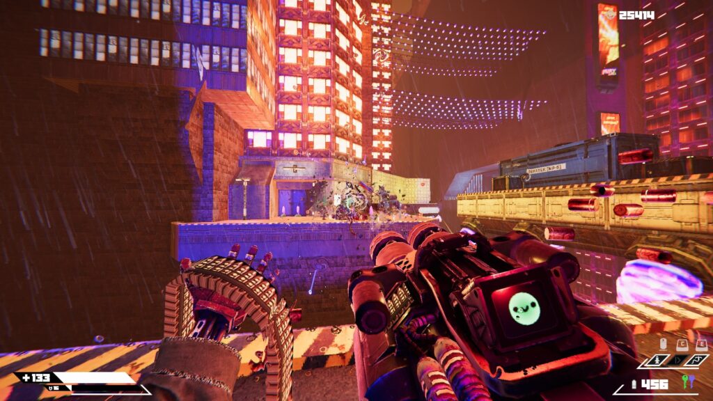 بزرگترین نقطه قوت این بازی اما در گیمپلی آن نهفته شده. چیزی که باعث شده تا Turbo Overkill با بسیاری از شوترهای اول شخص بازار متفاوت باشد، آزادی عملی است که در زمینه حرکت به گیمر ارائه میکند. جدای از فرم حرکتی نرم و سریع شوترهای دهه نودی، اینجا با حضور بخش عمدهای از قابلیتهای حرکتی بازیهای مدرن همچون TitanFall روبرو هستیم. با این تفاسیر شما در هر لحظه بازی و در هر نقطهای که قرار بگیرید، میتوانید به شکل دلخواه خود از آن خارج شوید. آزادی عمل در این زمینه به قدری زیاد است که سازندگان بازی حتی به سمت طراحی ساختارهای پلتفرمر در مراحل مختلف رفته و این گزینه را پیش روی شما قرار میدهند که به شکلی که میخواهید بازی را دنبال کنید. هرچند در مراحل ابتدایی شاهد طراحیهای خطی هستیم اما به مرور و با افزایش قابلیتهای شخصیت اصلی، محیطها به مرور بزرگتر شده و مسیرهای مخلتفی در آنها قرار میگیرد. زمانی این موضوع را در کنار آزادی عمل گیمر در زمینه حرکت قرار میدهیم، با نتایجی هیجانانگیز و خارقالعاده روبرو میشویم که میتواند هر علاقهمندی به شوترهای اول شخص را جذب خود کند. این نکته را هم نباید فراموش کرد که تمامی قابلیتها و امکانات حاضر در گیمپلی بازی در یک مسیر مشخص یعنی حرکت سریع و بدون توقف قرار میگیرند. جالب است که حتی بخشی از قابلیتهای حرکتی شخصیت اصلی به شکل مستقیم در مبارزات نیز نقش خود را نشان میدهد و گیمر میتواند به طور مثال با استفاده از Slide، اره برقی پنهان شده در پای شخصیت اصلی را فعال کرده و حجم زیادی از دشمنها را در یک چشم به هم زدن نابود کند. بازی در زمان شروع مبارزات دست گیمر را باز نگه میدارد تا هر آن چیزی که به دنبالش است را دریافت و تجربه کند. این موضوع به واسطه حضور تعداد زیادی اسلحه متنوع محقق شده. اسلحههایی که هر کدام دو شکل شلیک متفاوت را به نمایش گذاشته و حتی قابلیت ارتقا آنها نیز وجود دارد. با اینکه بسیاری از اسلحهها شباهت زیادی به نمونههای مشابه در دیگر عناوین این ژانر دارند اما شاهد نوآوریهای خاصی هستیم که این روزها کمتر دیده میشوند. در این میان شاید جذابترین نمونه به Sniper بازی ارتباط پیدا کند که در حالت دوم شلیک خود شخصیت اصلی را وارد بدن حریف کرده و در یک لحظه فاصله زیادی را از جریان گیمپلی حذف میکند. رویکردی این چنینی در تمامی نقاط بازی دیده میشود و همین موضوع جریانی از گیمپلی را شکل داده در بازههای زمانی درست از سرعت خود کاسته و زمانی که وارد درگیری میشود به قدری و نفس گیر دنبال میشود که میتواند هر مخاطبی را میخکوب کند.